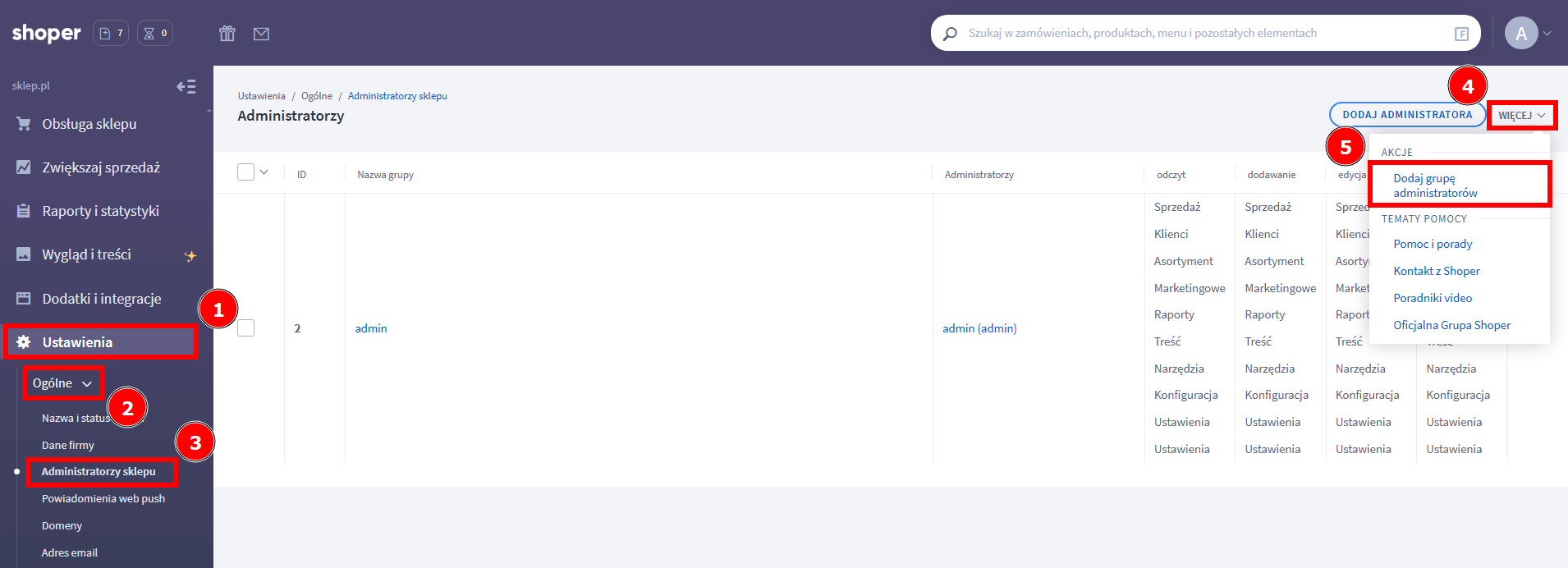 - Przejdź do Ustawienia (1) → Ogólne (2) → Administratorzy sklepu (3).