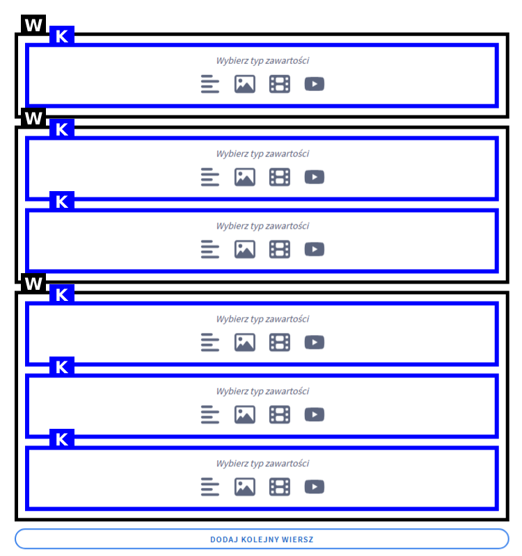 Edytor treści umożliwia dodawanie nowych wierszy i kolumn do układu treści, edycje dodanych treści, duplikowanie, usunięcie czy zmianę kolejności wierszy.