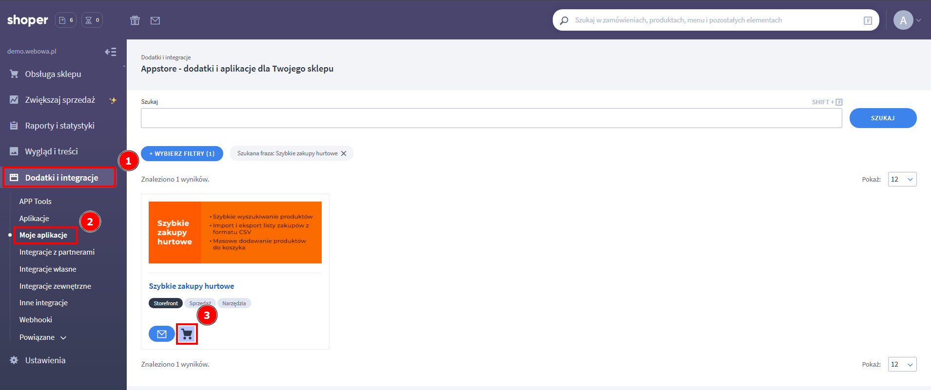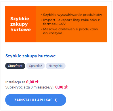 - W zakładce Dodatki i integracje → Aplikacje wyszukaj aplikację Szybkie zakupy hurtowe i kliknij przycisk Zainstaluj aplikację.