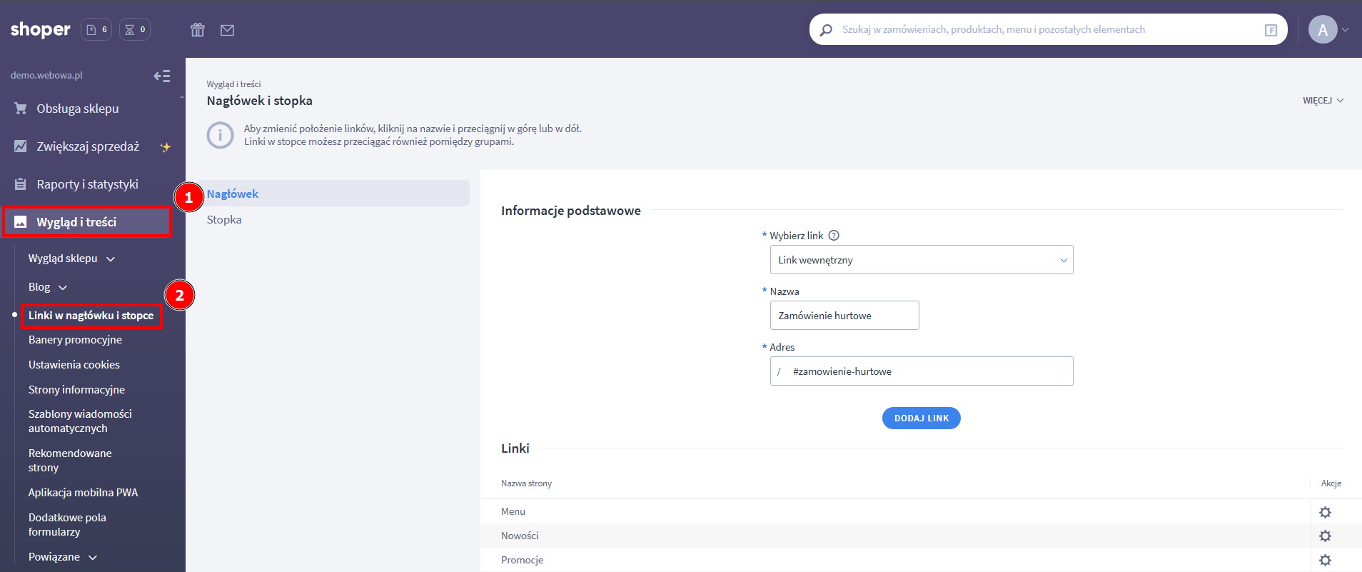 - Przejdź do Wygląd i treści → Linki w nagłówku i stopce.