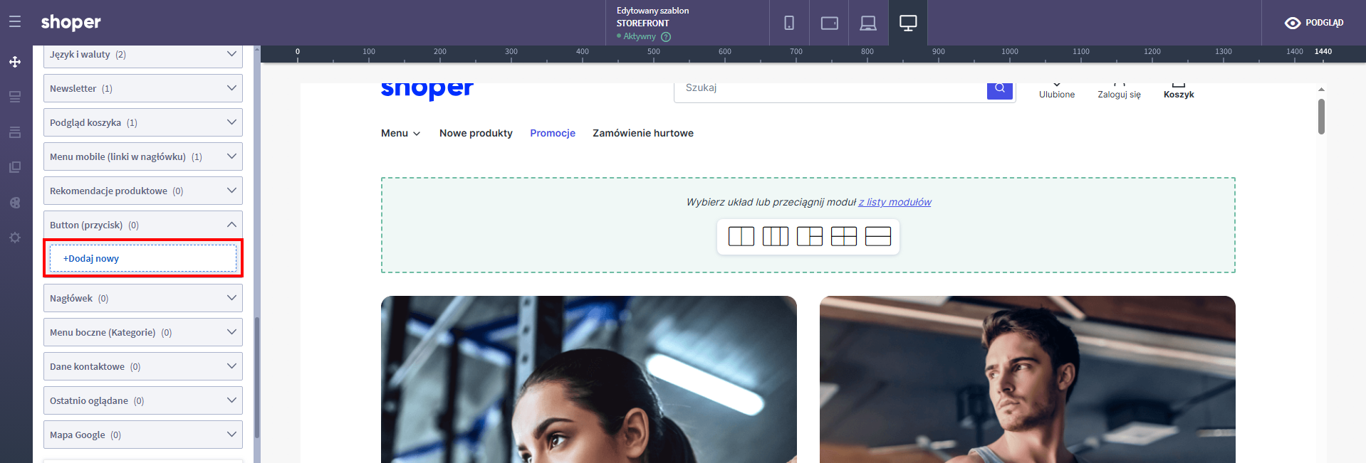 - Przeciągnij moduł Dodaj nowy w wybrane miejsce w sklepie.