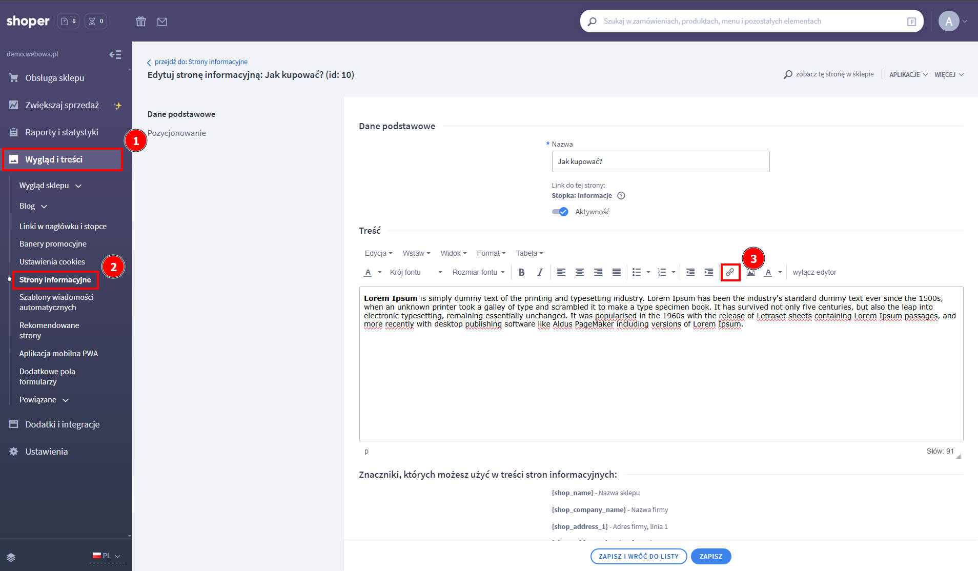 - Przejdź do Wygląd i treści → Strony informacyjne.