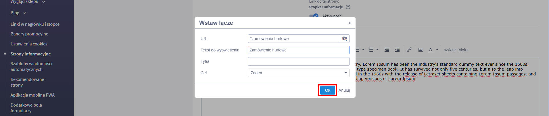- W polu Adres URL strony wprowadź wartość /#zamowienie-hurtowe