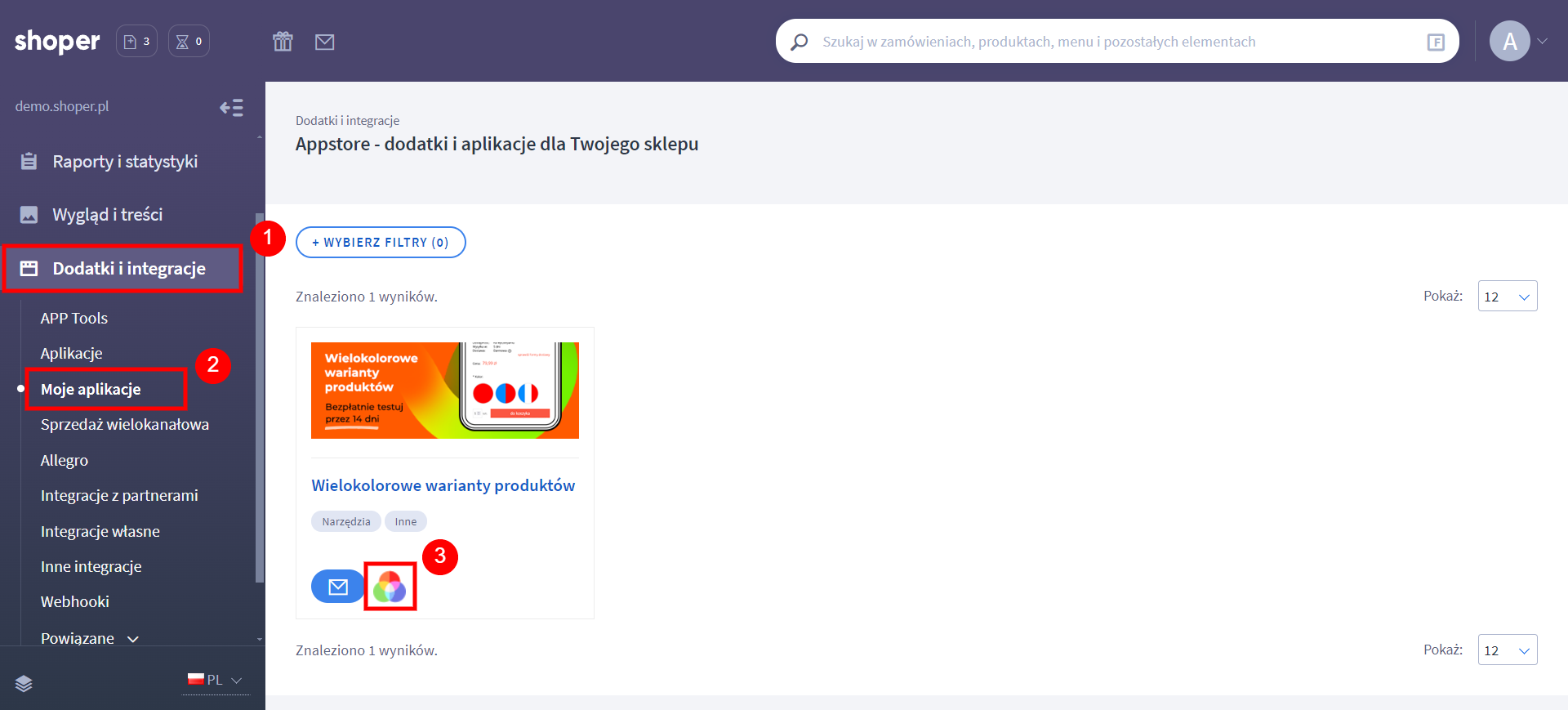 - W zakładce Dodatki i integracje → Moje aplikacje wyszukaj Wielokolorowe warianty produktów i kliknij ikonę aplikacji.