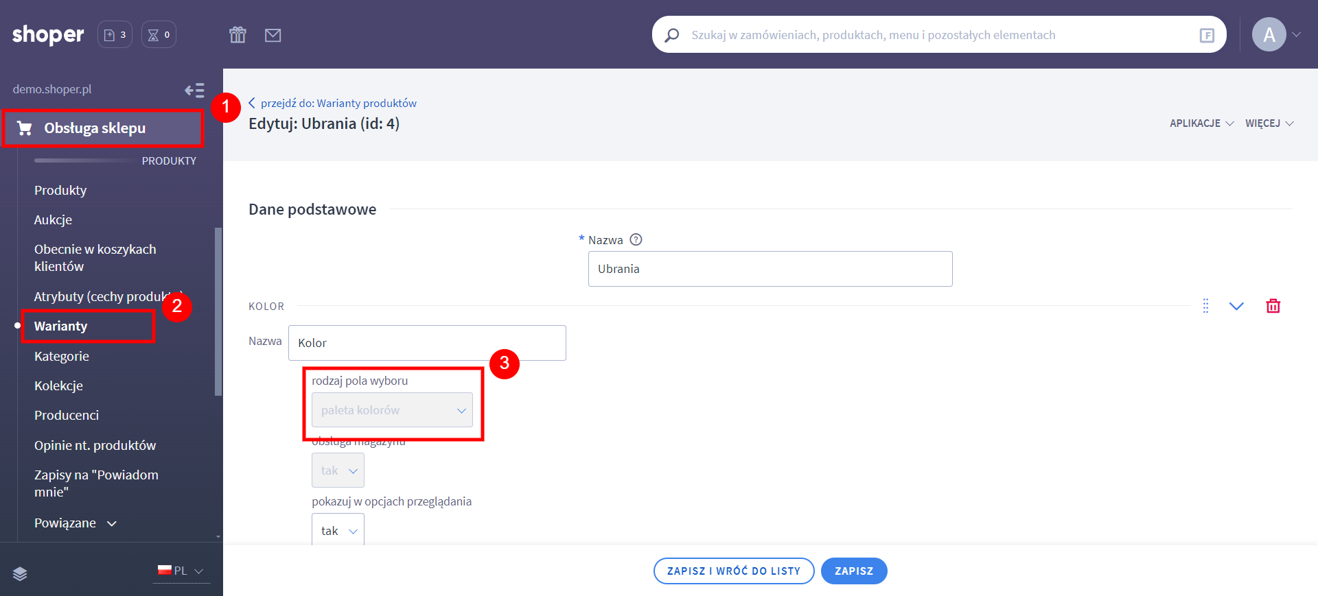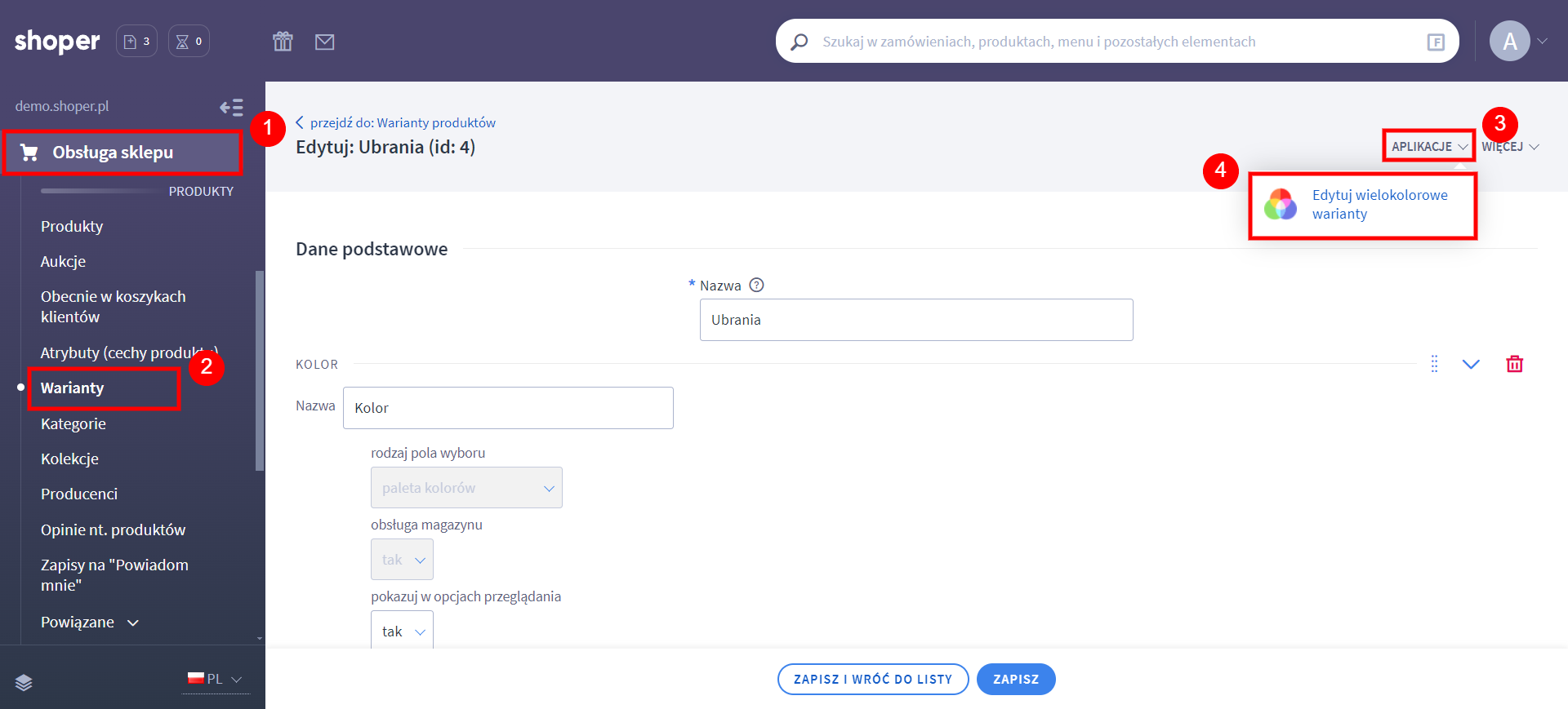 - W zakładce Obsługa sklepu → Warianty przejdź do edycji wariantu z paletą kolorów.