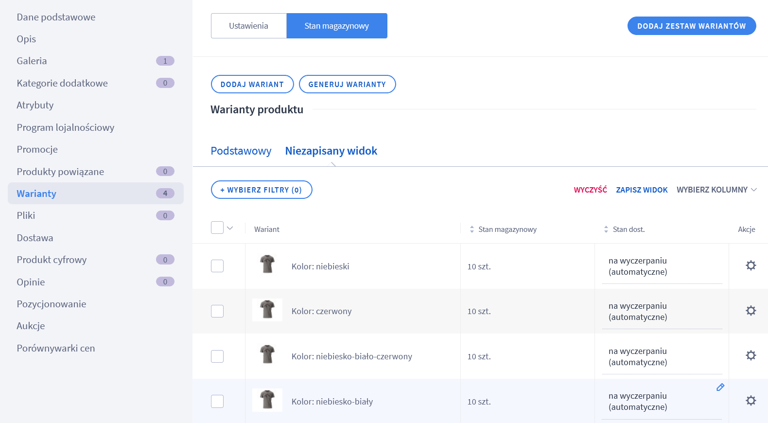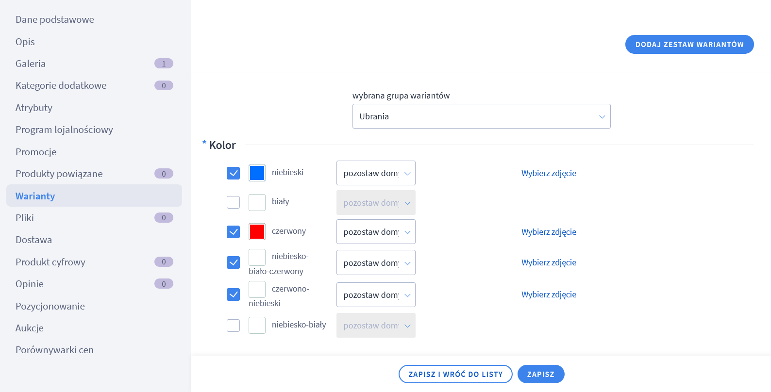 - Przycisk Dodaj wariant pozwala na ręczne tworzenie każdej kombinacji, np. kolor niebiesko-biało-czerwony i rozmiar M (lub po prostu kolor czerwony, jeżeli utworzona została jedna cecha).