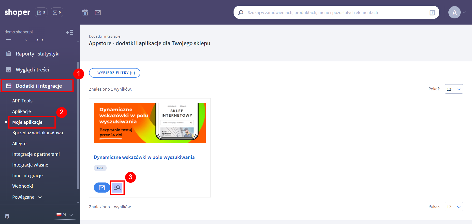 - W zakładce Dodatki i integracje → Moje aplikacje wyszukaj Dynamiczne wskazówki w polu wyszukiwania i kliknij ikonę aplikacji.