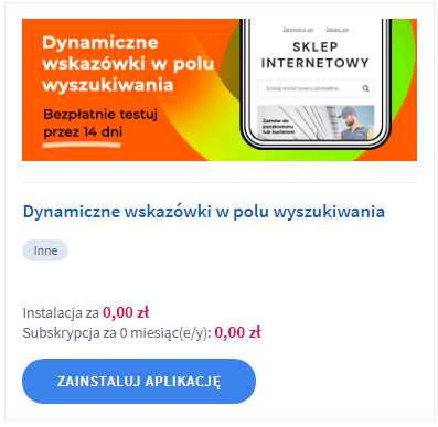 Aplikacja umożliwia zdefiniowanie wskazówek wyświetlanych w polu wyszukiwania dla różnych wersji językowych sklepu.