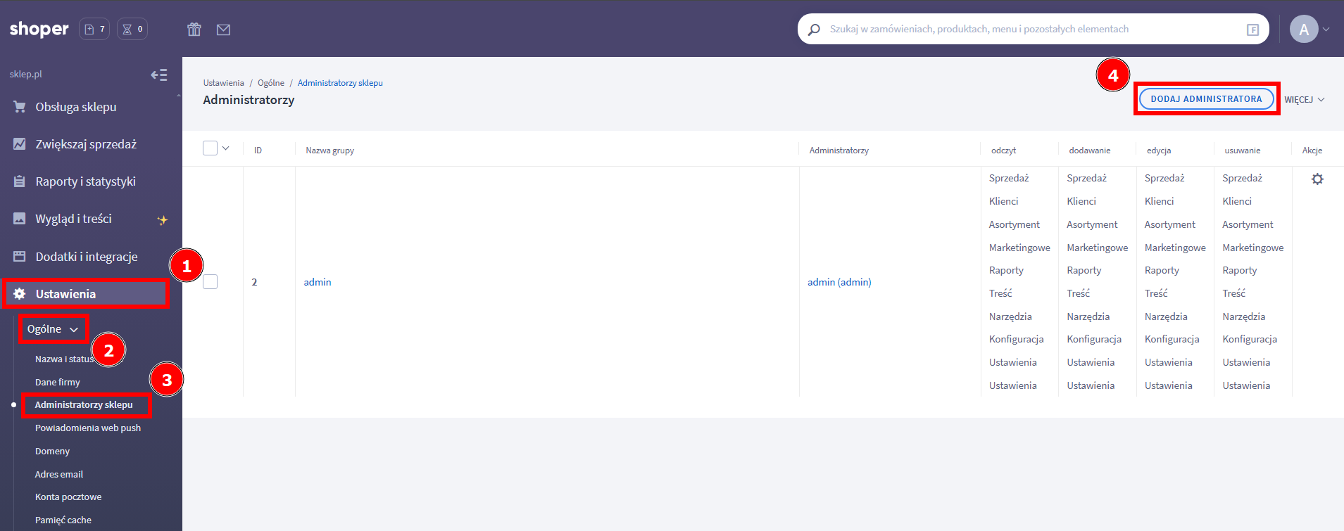 - Przejdź do Ustawienia (1) → Ogólne (2) → Administratorzy sklepu (3).